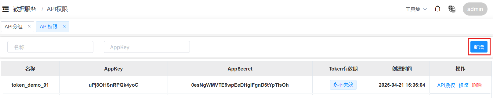 设置名称、Token有效期和描述信息后,点击“确定”按钮,完成API授权的新增。在API授权列表中,将会显示系统自动生成的API授权的AppKey和AppSecret信息,如下图。